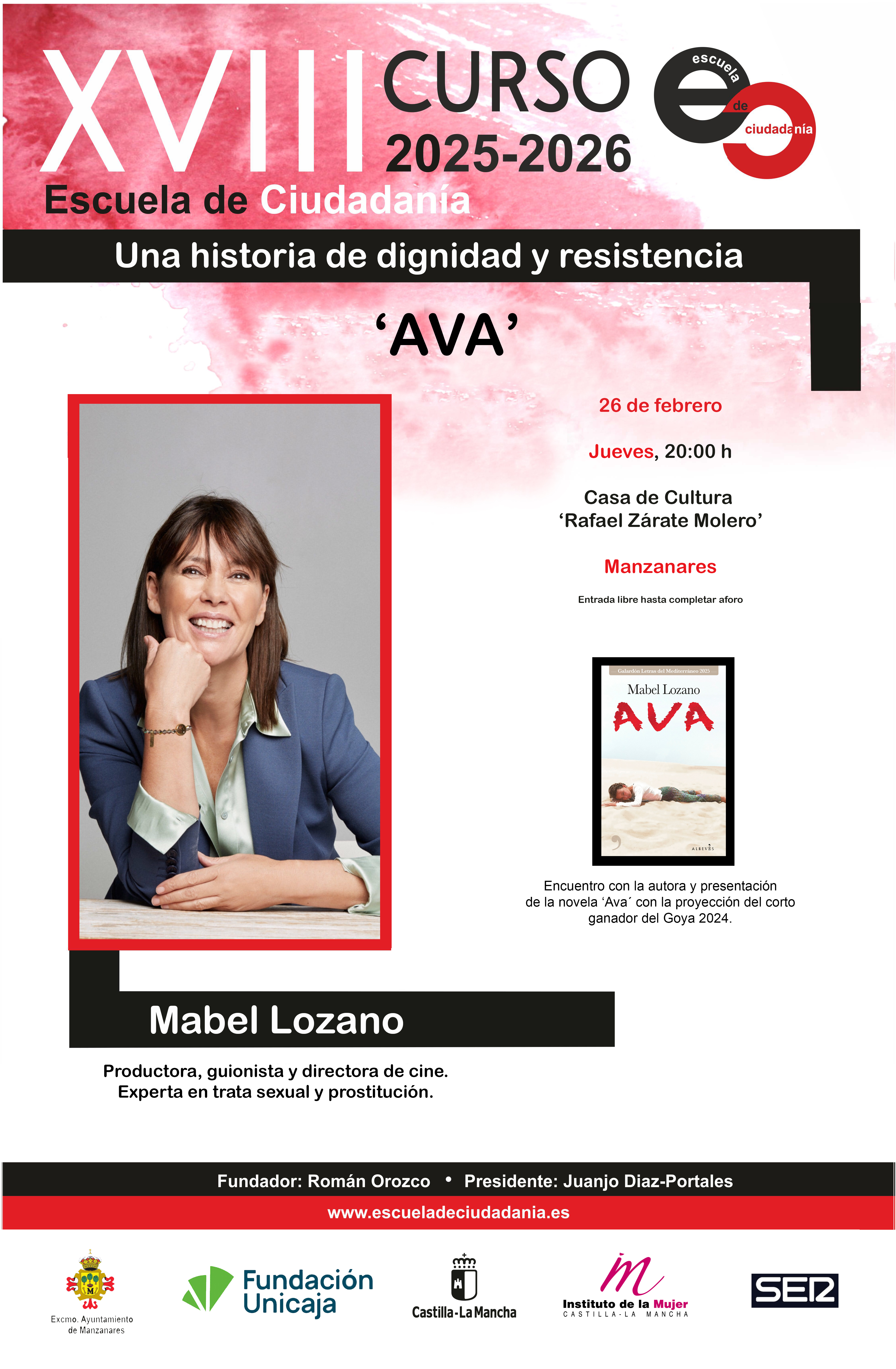 La Escuela de Ciudadanía retoma las conferencias de su XVIII Curso el próximo jueves, 26 de febrero, con un encuentro con la guionista, productora y directora de cine Mabel Lozano. A partir de las 20:00 horas presentará ‘Ava’, su primera novela de ficción, una historia sobre el mundo de la prostitución. En el acto se proyectará también el cortometraje del mismo título, con el que la cineasta toledana ganó en 2024 el Goya al mejor corto documental.