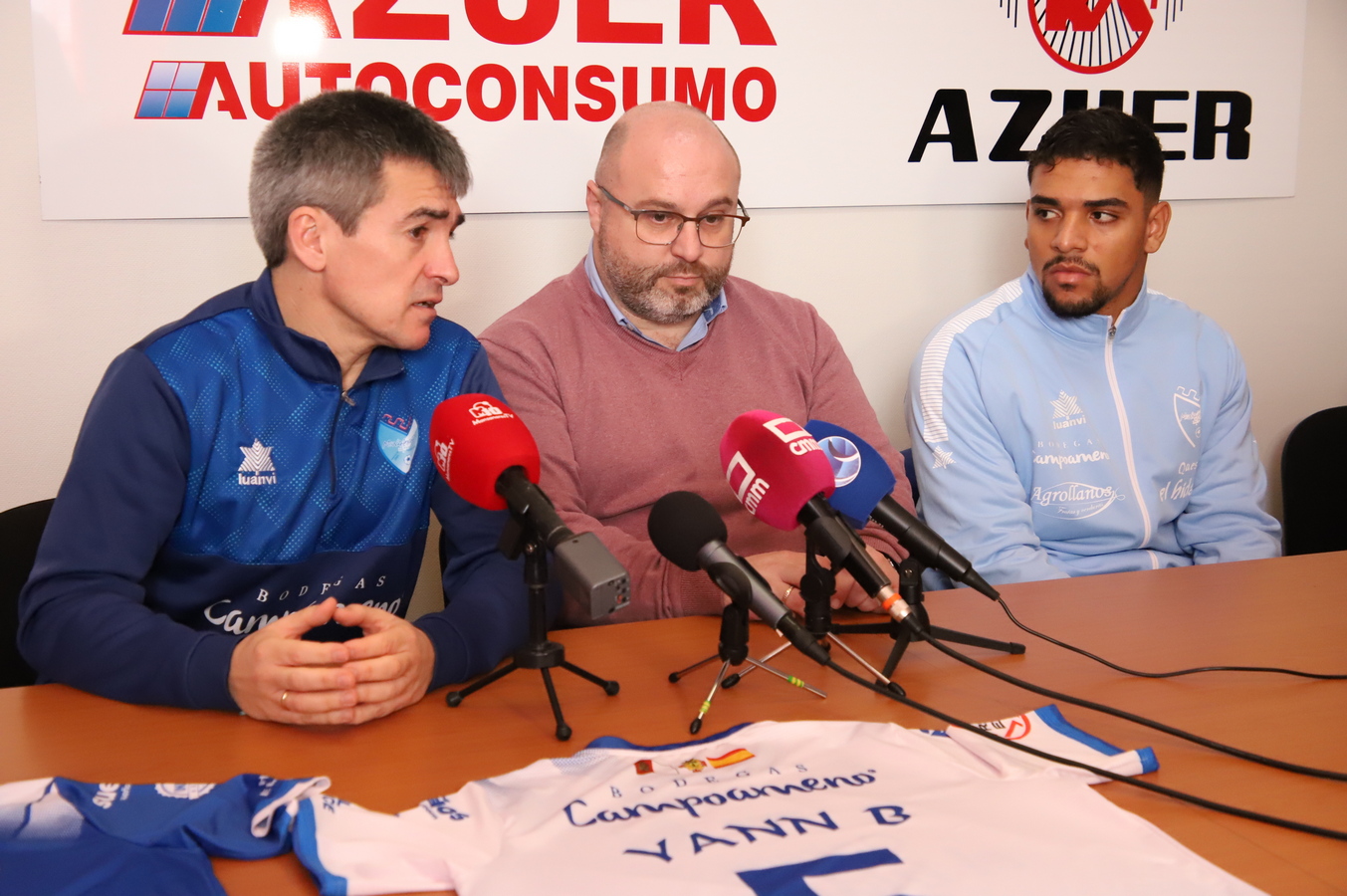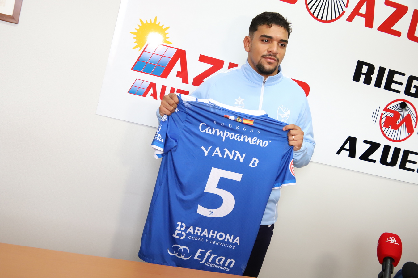 Yann Barbosa ha sido presentado esta mañana como nuevo jugador del Quesos El Hidalgo Manzanares FS. El pívot brasileño, que ha firmado por dos temporadas y media, ha estado acompañado por el entrenador Juanlu Alonso y el presidente Manolo del Salto. En sus primeras declaraciones como azulón, Yann Barbosa se ha mostrado muy ambicioso: llega con el objetivo “de llegar a finales y ser campeón”.