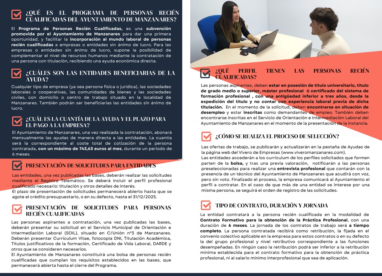 Por quinto año, el Ayuntamiento de Manzanares promueve el programa de inserción laboral para personas recién cualificadas. Quienes busquen una primera oportunidad laboral en Manzanares y las empresas de la localidad que necesiten reforzar su plantilla pueden presentar ya sus solicitudes.