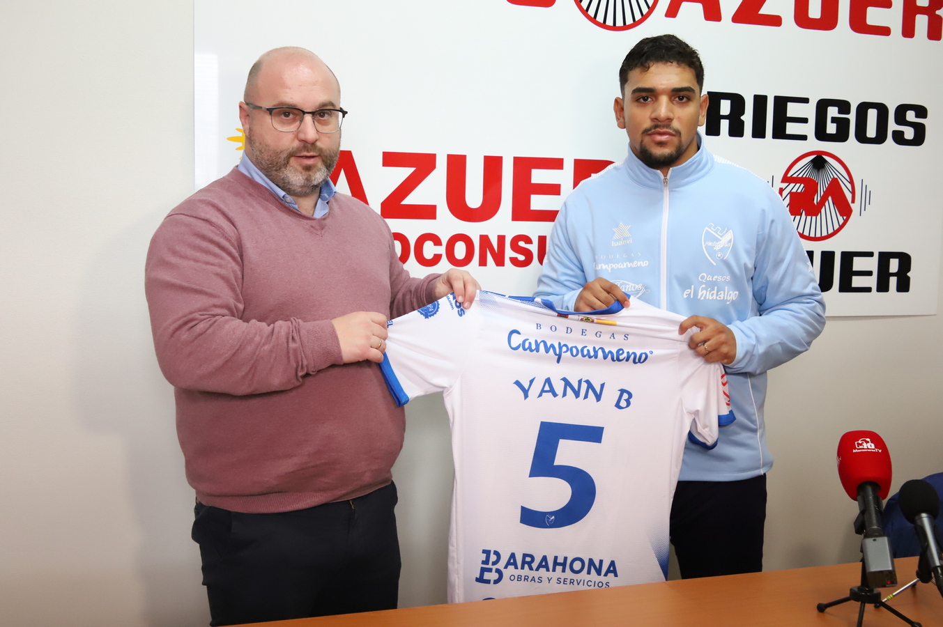 Yann Barbosa ha sido presentado esta mañana como nuevo jugador del Quesos El Hidalgo Manzanares FS. El pívot brasileño, que ha firmado por dos temporadas y media, ha estado acompañado por el entrenador Juanlu Alonso y el presidente Manolo del Salto. En sus primeras declaraciones como azulón, Yann Barbosa se ha mostrado muy ambicioso: llega con el objetivo “de llegar a finales y ser campeón”.