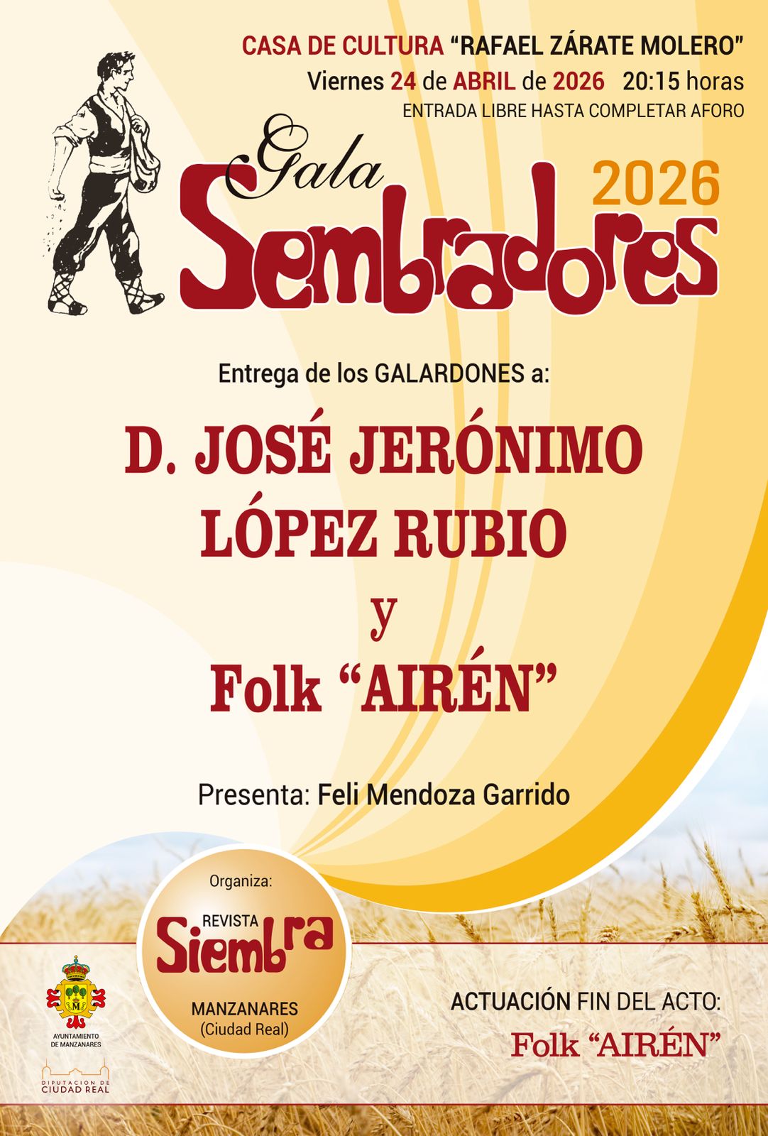 Otro de los eventos destacados esta semana es la tradicional Gala Sembradores, organizada por la Revista Siembra, que reconocerá este año al sacerdote José Jerónimo López Rubio y al grupo Folk Airén. El acto, que se celebra este viernes a las 20:15 horas en la Casa de Cultura ‘Rafael Zárate Molero’ con entrada libre hasta completar aforo, estará presentado por Feli Mendoza y contará con actuación musical de Folk Airén.