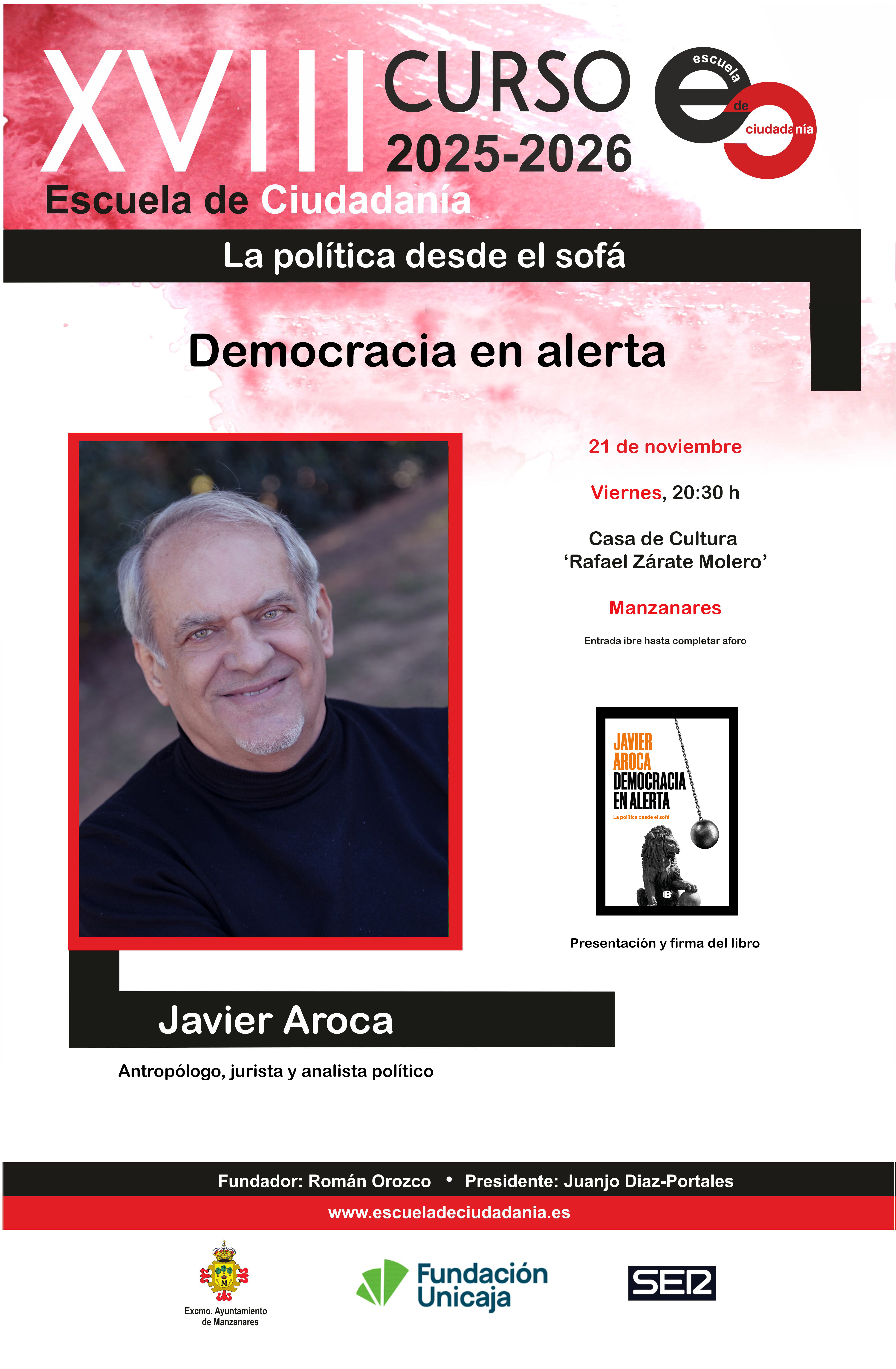En un momento en el que, medio siglo después de la muerte de Franco, rebrotan quienes prefieren un régimen autoritario a la democracia, llega a la Escuela de Ciudadanía de Manzanares el conocido antropólogo, jurista y analista político Javier Aroca para hablar del estado de alerta en el que se encuentra la democracia española. Este viernes, 21 de noviembre, presentará su último libro: Democracia en alerta. La política desde el sofá.
