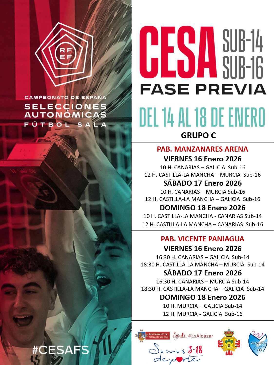 Con entrada gratuita en ambas localidades, el Grupo C del CESA 2026 de fútbol sala se abrirá en el ‘Manzanares Arena’ el viernes 16 con el partido entre las selecciones Sub-16 de Canarias y Galicia a las 10:00 y de Castilla-La Mancha y Murcia a las 12:00 horas. A la mañana siguiente se enfrentarán Canarias-Murcia y Castilla-La Mancha-Galicia, también Sub-16; y el domingo, doble compromiso entre castellano-manchegos y canarios a las 10:00 en Sub-14 y a las 12:00 en Sub-16. En Alcázar se jugarán la mayoría de partidos Sub-14 a partir de la tarde del viernes.