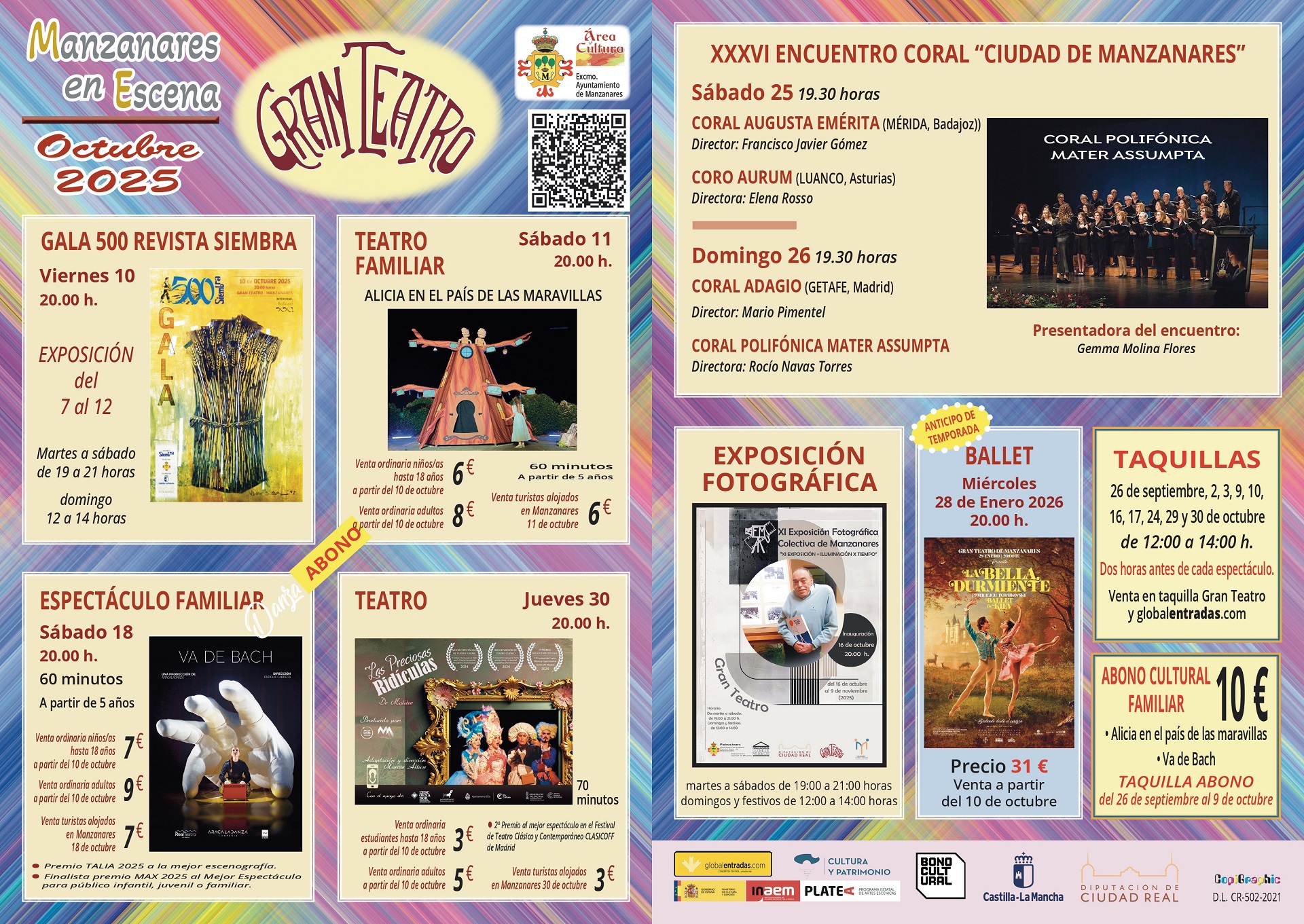 Además del cine, la programación cultural del Ayuntamiento de Manzanares para el mes de octubre ofrece otras interesantes propuestas en el Gran Teatro. El viernes 10 (20 horas) la revista 'Siembra' celebrará la gala conmemorativa de su número 500, con una exposición en el hall que se podrá visitar entre el 7 y el 10. El sábado 11 y el sábado 18 (20 horas) se representarán el teatro 'Alicia en el País de las Maravillas' y el espectáculo de danza 'Va de Bach', que se incluyen dentro del abono cultural familiar por 10 euros. Y el jueves 30 (20 horas) se pondrá en escena el teatro 'Las preciosas ridículas'.