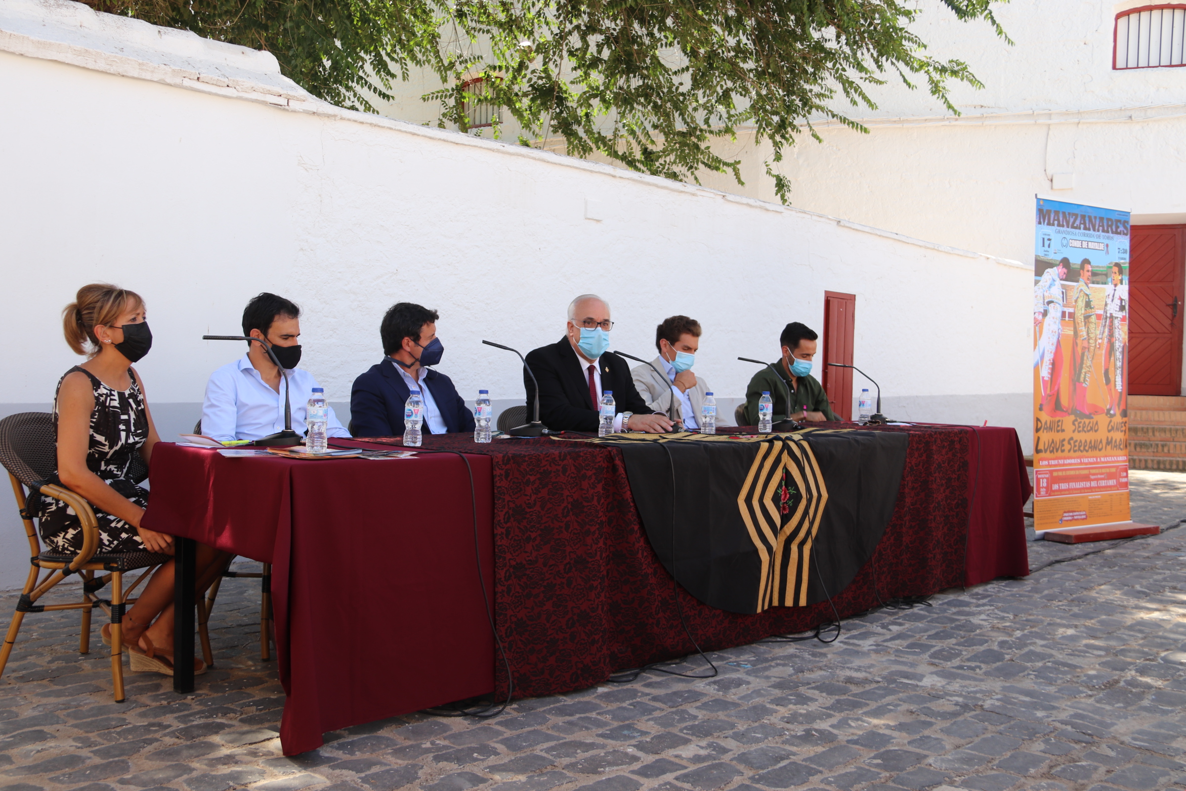 La empresa ‘Toros pal toreo’ presentó los carteles de la feria taurina 2021 de Manzanares en el patio de autoridades del histórico coso de la Avenida de Andalucía en un acto que contó con la presencia de dos de los protagonistas de la corrida del día 17, Sergio Serrano y Ginés Marín, que ese día harán el paseíllo junto a Daniel Luque. El empresario y torero Manuel Amador ha configurado un cartel con los máximos triunfadores del momento.