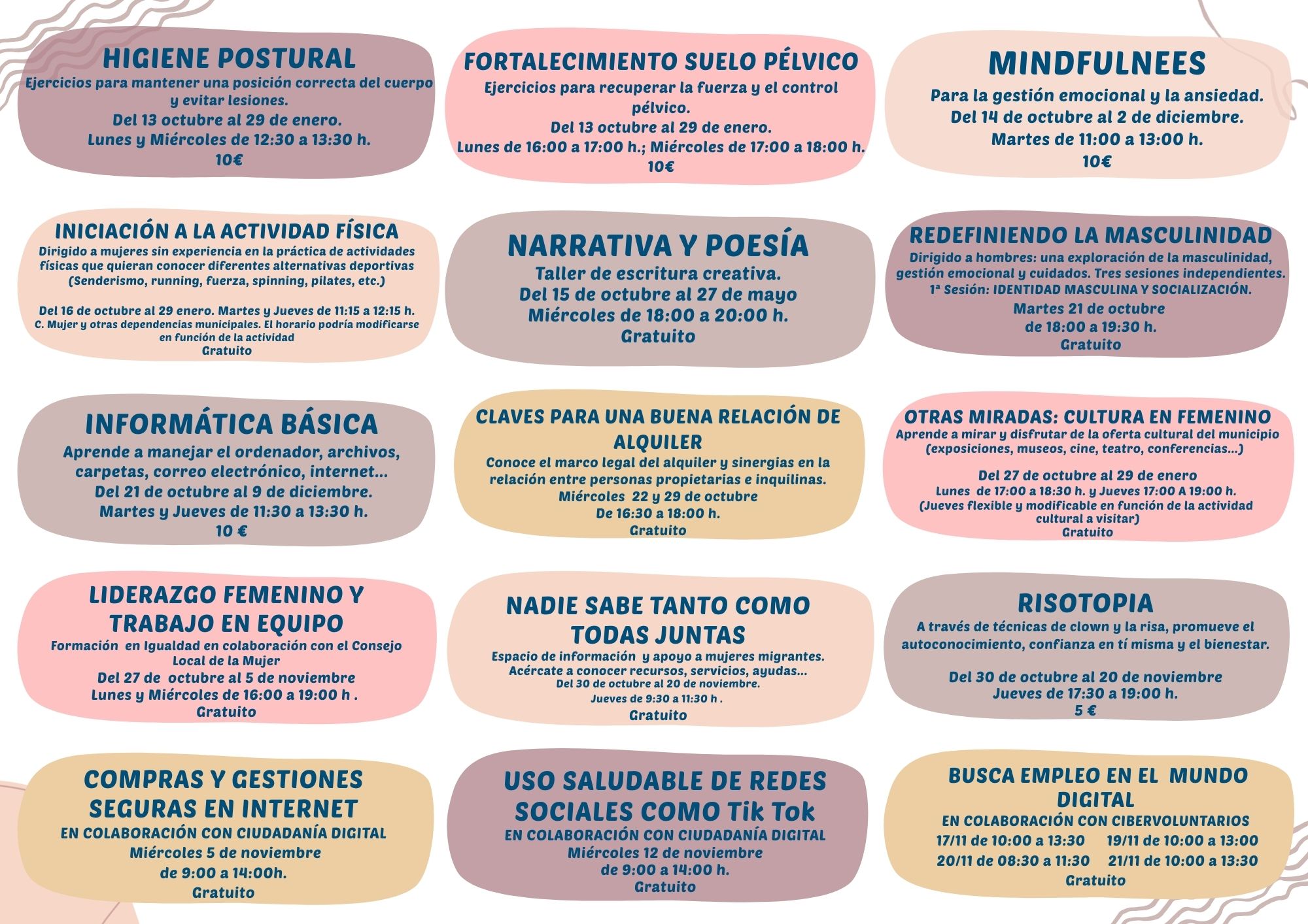Y, además de estas novedades, el Centro de la Mujer sigue apostando por un amplio programa formativo que tiene como objetivo romper las brechas de género en diferentes ámbitos, como el digital, laboral o en el de la salud. Se mantienen cursos tradicionales como el de manipulación de alimentos; higiene postural, fortalecimiento de suelo pélvico, mindfulness, autocuidado o iniciación a la actividad física; informática básica, búsqueda de empleo en el mundo digital, compras seguras en Internet o uso de las redes sociales; así como narrativa y poesía, liderazgo femenino o risoterapia, y el espacio de apoyo a mujeres migrantes, entre otros.