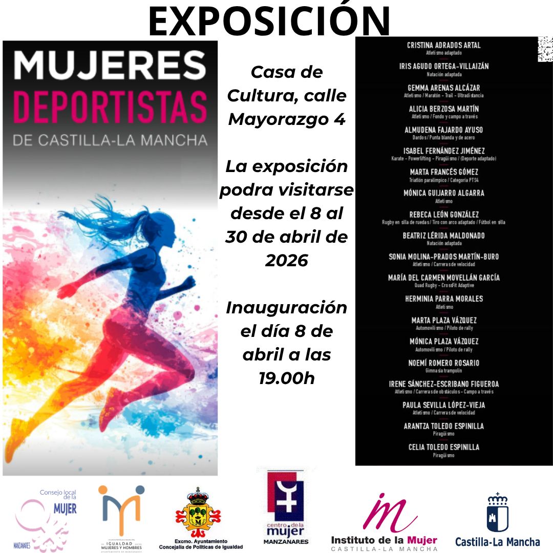 Aparte de los Encuentros en torno al 27, la agenda cultural de esta semana incluye otros eventos. También en la tarde de este miércoles (19 horas) se inaugurará la exposición 'Mujeres deportistas de Castilla-La Mancha', de la que forma parte la atleta manzanareña Sonia Molina-Prados. Permanecerá instalada en la Casa de Cultura hasta el 30 de abril.