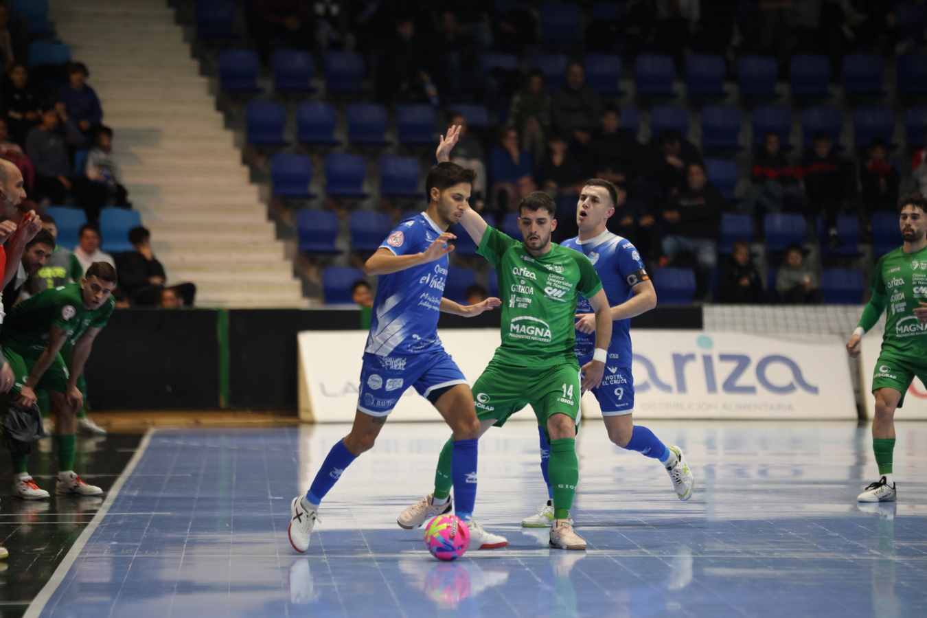 El pabellón 'Anaitasuna' acogió el sábado un bonito duelo entre CA Osasuna Magna y Quesos El Hidalgo Manzanares FS. Comenzó de la manera que ya se está convirtiendo en habitual para los azulones: con un gol en contra. Fue Ion Cerviño el que abrió el marcador en el 5' con un potente derechazo ante el que poco pudo hacer Antonio Navarro. Dos minutos después, Yann Barbosa vivió su estreno goleador en la liga española con un tanto de pívot: recibió de espaldas, se dio la vuelta y envió un trallazo al fondo de la red.